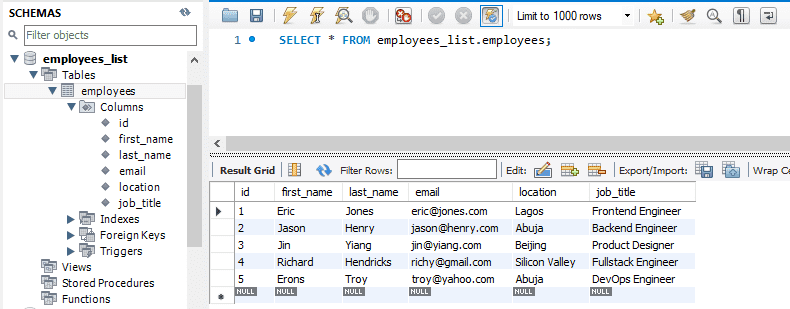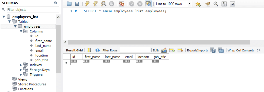 });Now go back to localhost:4000/create_employees_table, you should see “Employees table created” displayed in the browser. You’ve just create a table for your database. On MySQL workbench, this is how my database now looks.